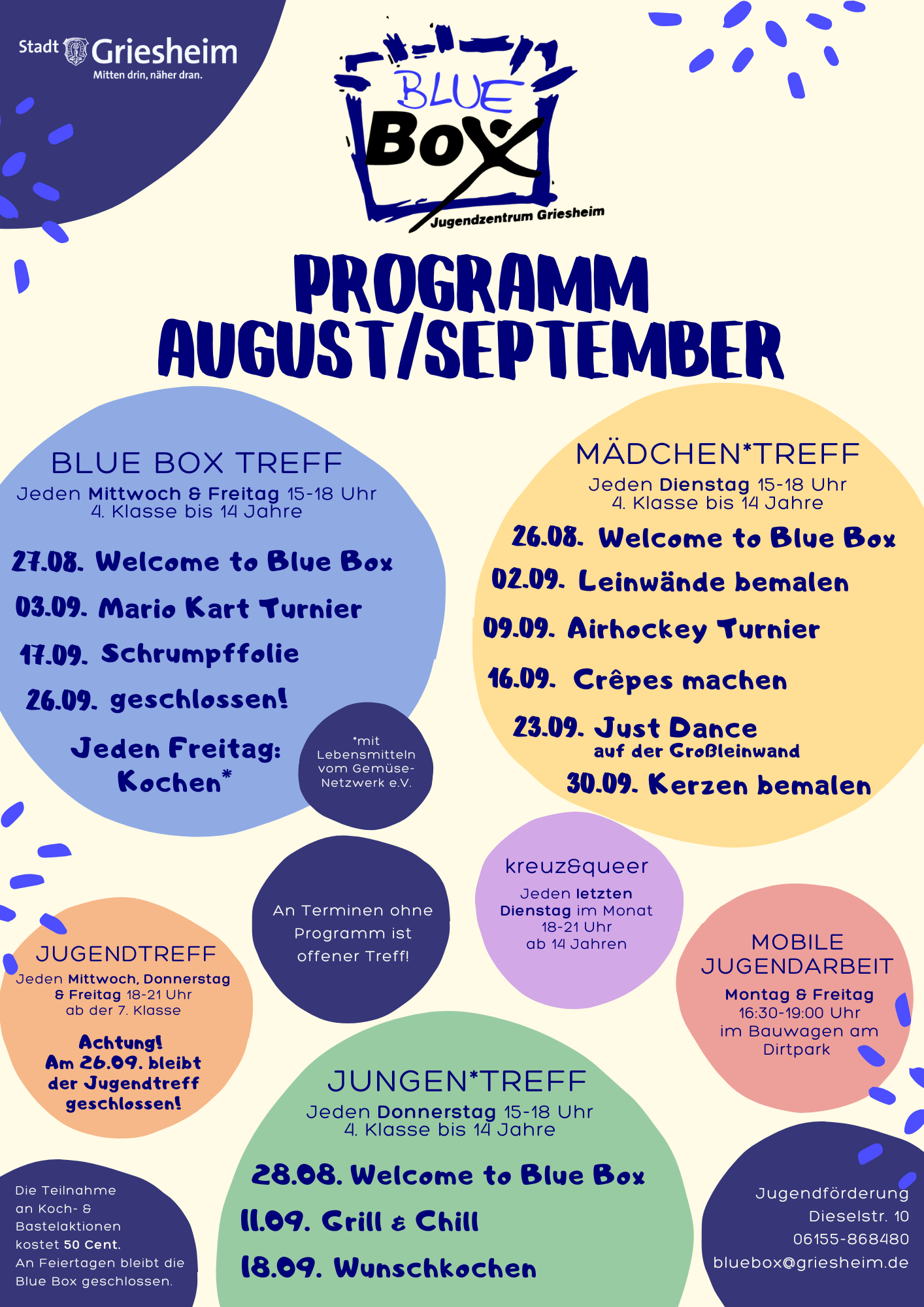 Ab dem 26. August ist die Sommerpause beendet und die Treffs können wieder besucht werden. Das Team der Jugendförderung freut sich auf viele neue und bekannte Gesichter.